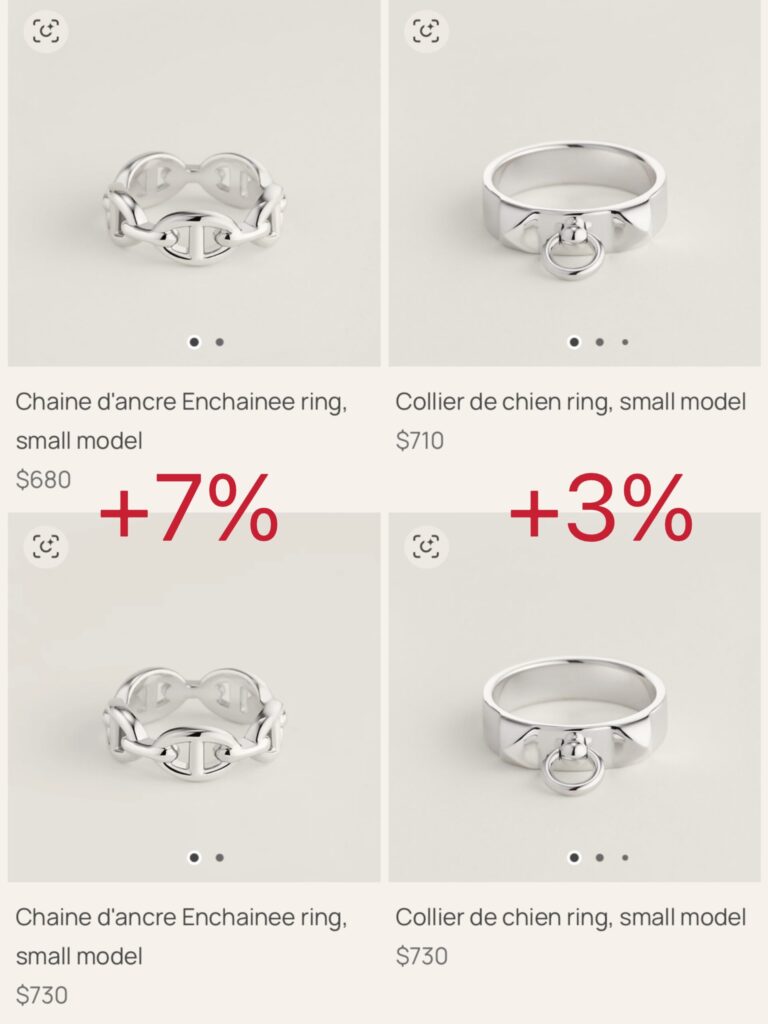 A clear example is the Chain d’Ancre silver ring. Although it uses the same silver as other rings, it saw a larger increase because it is one of Hermès’ most recognizable and consistently high demand designs. Less iconic silver pieces experienced smaller or no increases.