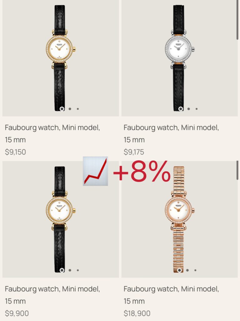 Classic and jewelry style watches, however, did increase. The Arceau 40 mm, a classic men’s dress watch, rose by around 4 percent, reflecting moderate production cost adjustments. Smaller and more decorative models, including Cape Cod small, Kelly, and Faubourg watches, saw higher increases of 6 to 8 percent, especially when precious metals or diamond pavé were involved.